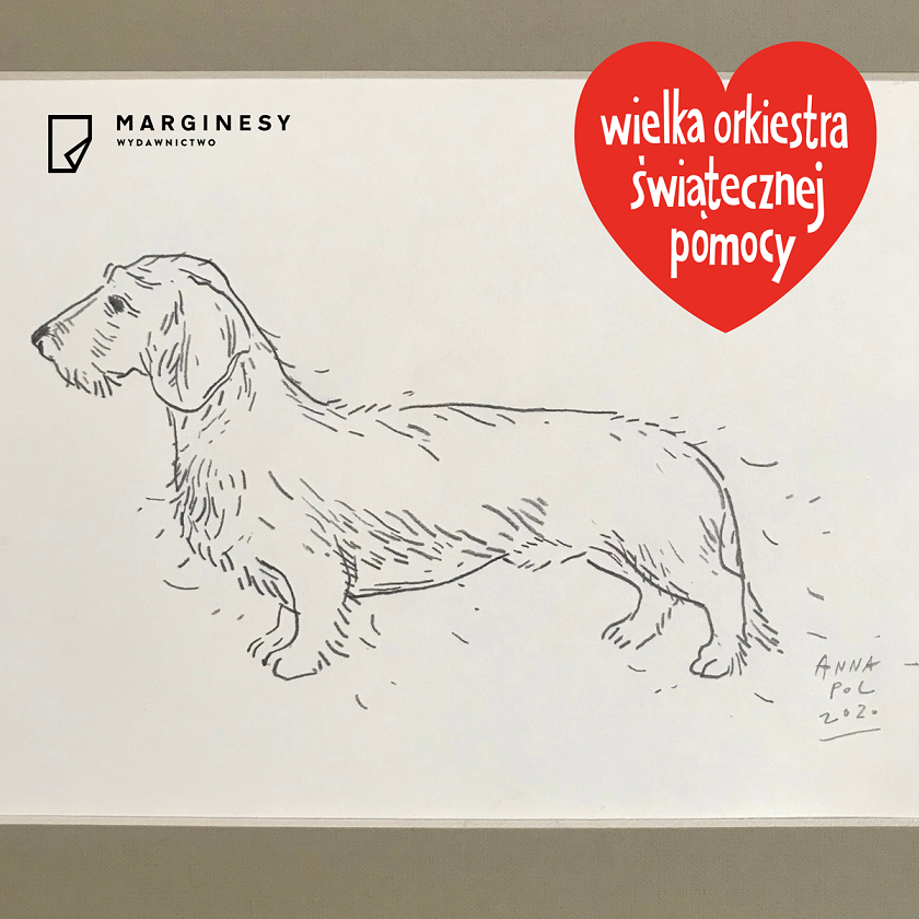 Naszą wizytówką jest dzisiaj piesek Anny Pol, licytowany w towarzystwie innych psów, rysowanych przez artystkę, które znajdziecie w książce Hau.